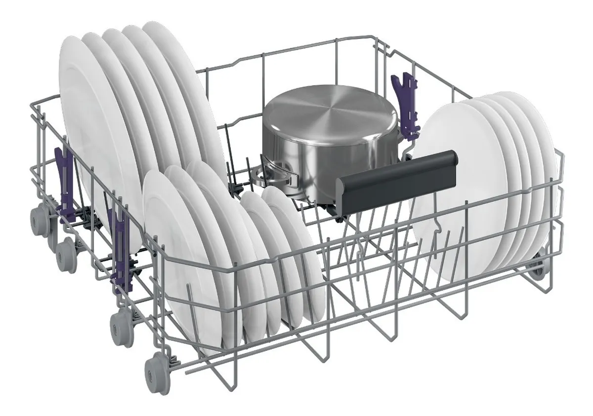 • Más espacio para ollas y sartenes. Cada vez que cocinas, utilizas ollas y sartenes de distintos tamaños, y necesitas un lavavajillas que se adapte a ello. El soporte plegable para la vajilla te permite liberar espacio reservado para platos para que encajen esas enormes ollas y sartenes. ¡Por fin se acabó tener que lavar a mano los utensilios más grandes!